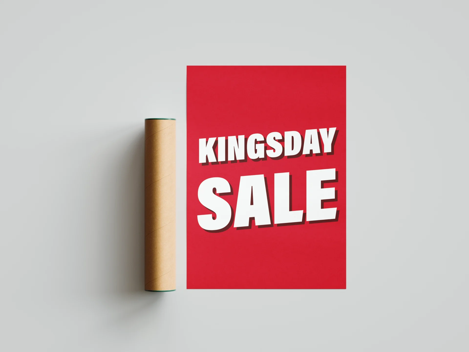 Promoot jouw Koningsdag korting met deze opvallende rode sale poster. Perfect voor winkels, marktkramen en evenementen tijdens Koningsdag.