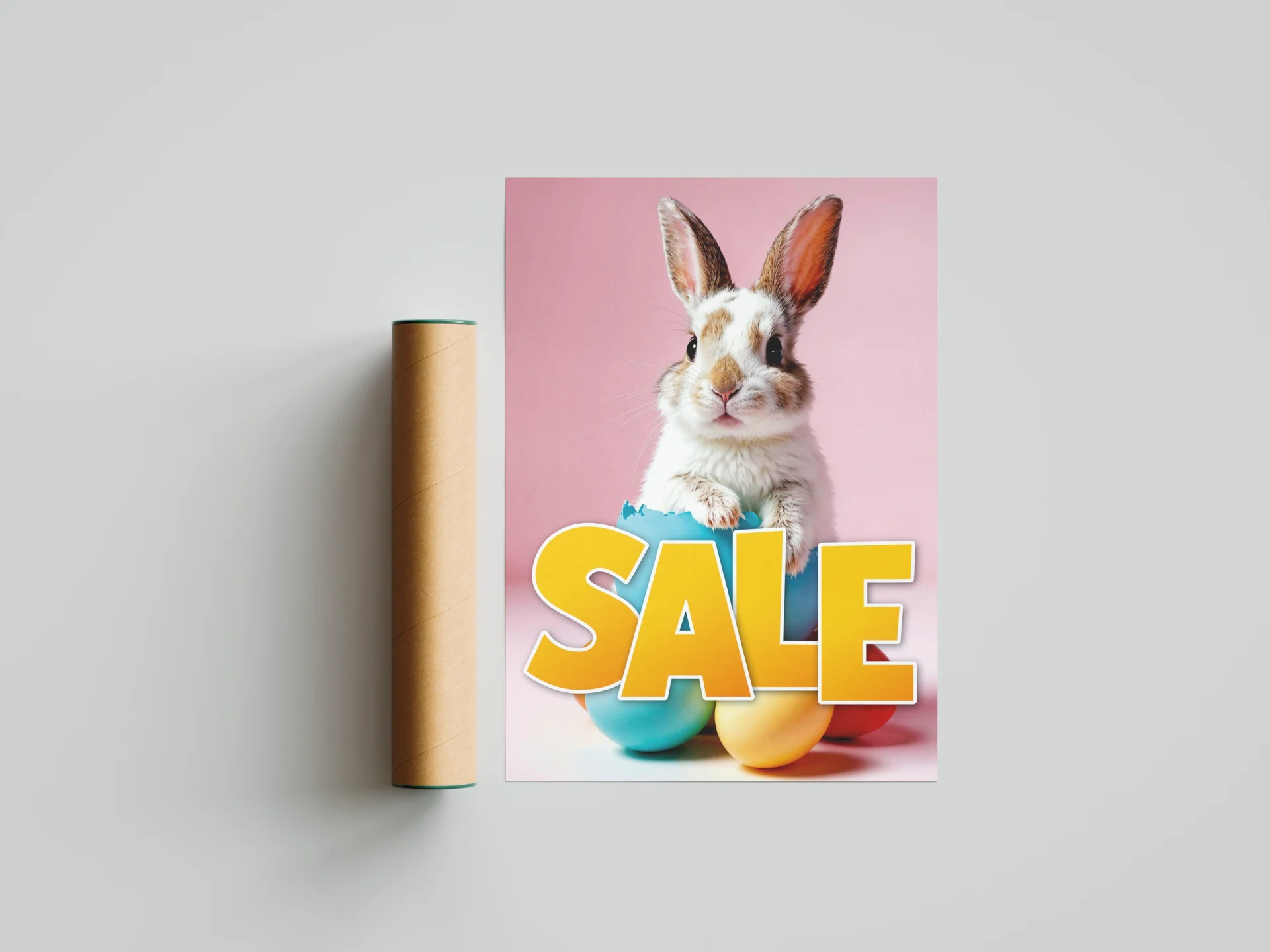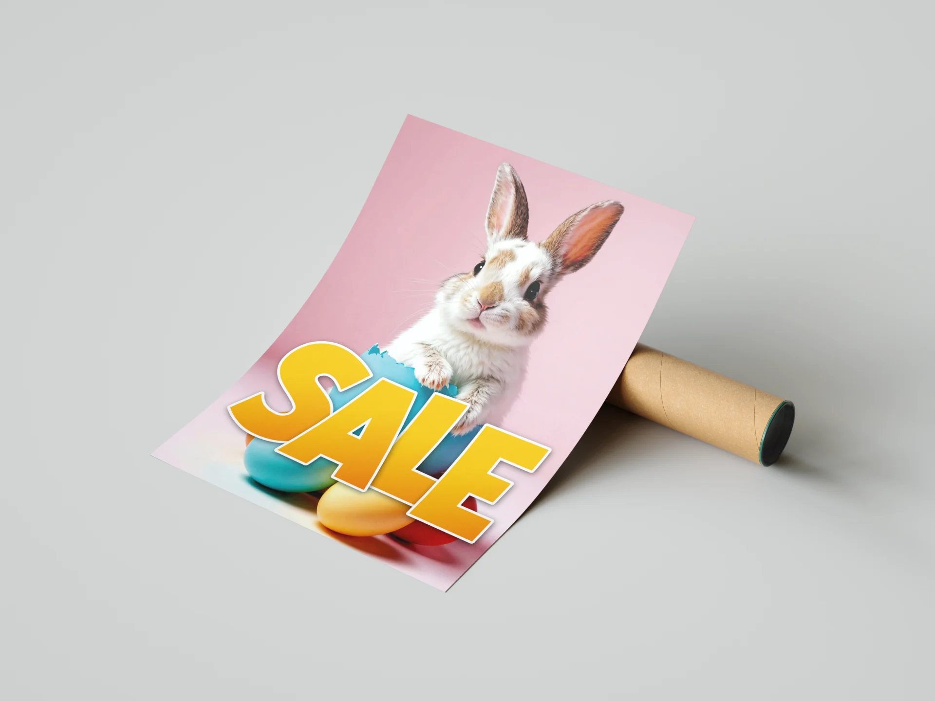 Dit vrolijke konijn helpt je graag om jouw voorjaarsacties op te laten vallen! Met de frisse lentekleuren en grote SALE boodschap is deze Paasposter een echte blikvanger in jouw winkel. De poster combineert een speels en uniek ontwerp met stijlvolle uitstraling. Hierdoor trek je wél de aandacht, maar blijft je winkel er verzorgd en aantrekkelijk uitzien. Perfect voor bloemenwinkels, conceptstores, cadeauwinkels en andere lifestyle winkels en speciaalzaken.
