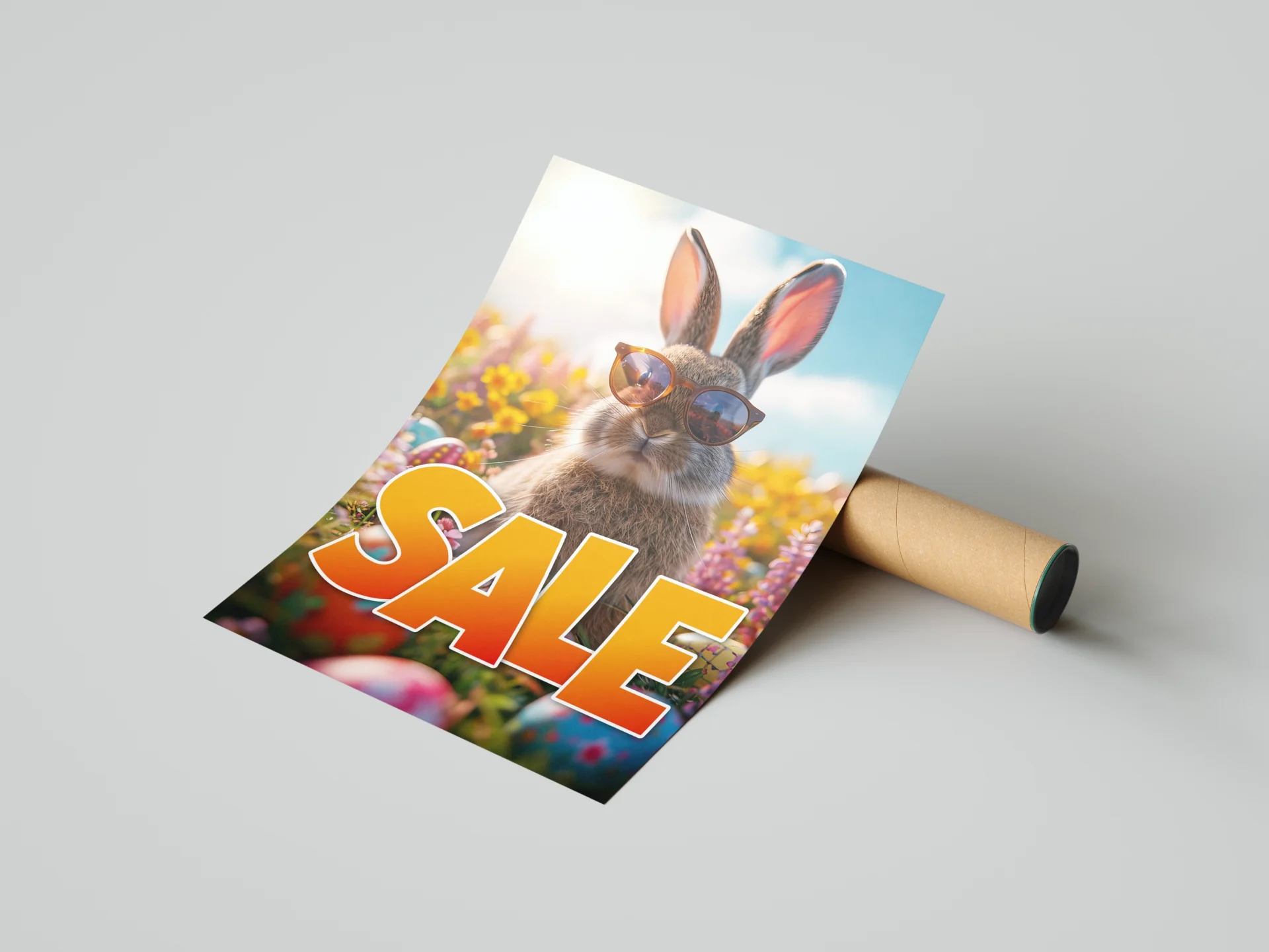 Dit vrolijke konijn helpt je graag om jouw voorjaarsacties op te laten vallen! Met zijn zonnebril, frisse lentekleuren en grote SALE boodschap is deze Paasposter een echte blikvanger in jouw winkel. De poster combineert een speels en uniek ontwerp met stijlvolle uitstraling. Hierdoor trek je wél de aandacht, maar blijft je winkel er verzorgd en aantrekkelijk uitzien. Perfect voor bloemenwinkels, conceptstores, cadeauwinkels en andere lifestyle winkels en speciaalzaken.